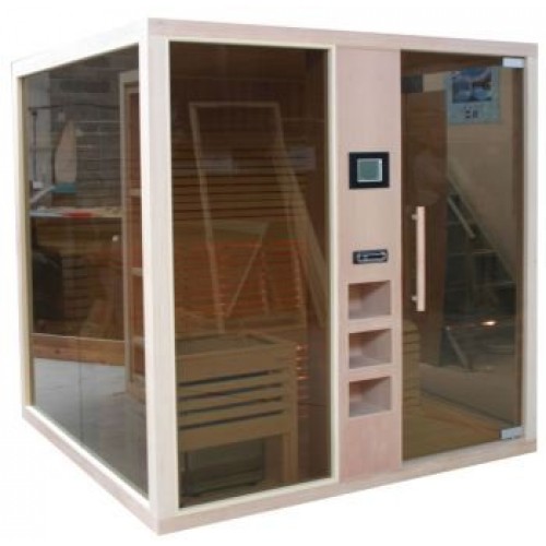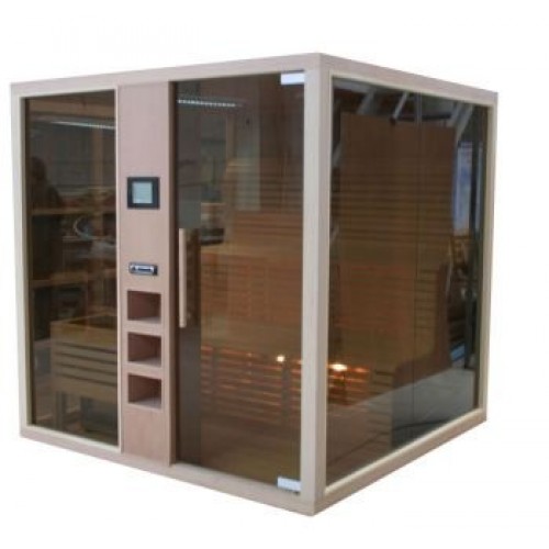 Сглобяема сауна от готови елементи, предварително изготвени панели, обшити вътрешно кедър, 2 броя стъклени стени, изработени от стъклопакет (вътрешното стъкло е закалено). Колони и конструкция на сауната изработени от масивна тройно слепена лиственица. Предна част, разделена на две равни части от декоративен модул, изработен от дървесина и покрит с МДФ бук, изкуствено състарен и тройно лакиран.