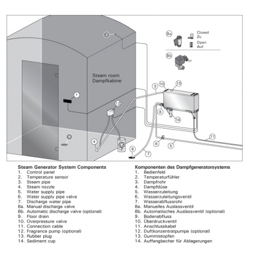 Препоръчително - употребявайте медени фитинги и тръби за прокарване на парата от парогенератора до парната кабина.Винаги слагайте омекотителна система за захранването от питейния водопровод на парогенератора.