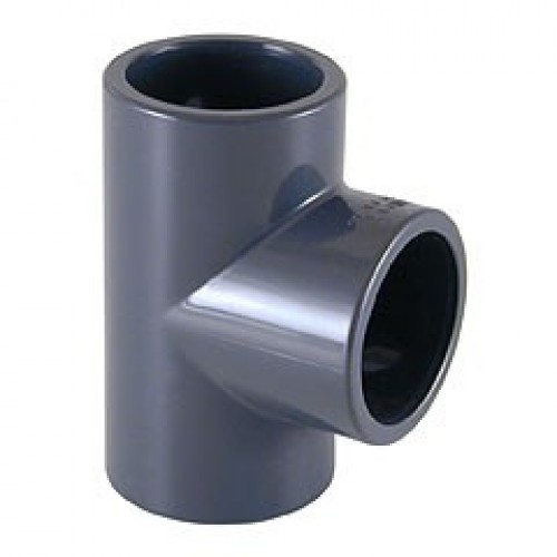 PVC тройник 90 градуса за лепене, изработен от PVC-U, за водопроводни инсталации и инсталации за басейни. Цвят – сив.